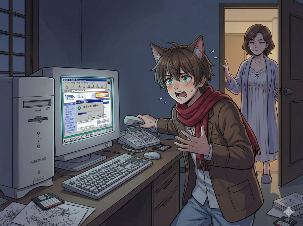 今では信じられないことですが、当時の私たちは、物理的な生活空間とデジタル空間の狭間で、必死に回線を死守していたのです。