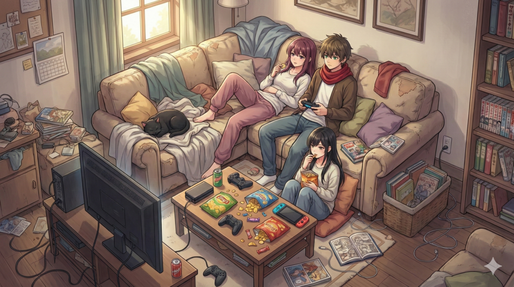休憩室 —— 完全なオフ、あるいは惰眠の場所 2026.01.102026.01.31 エレノア・ジン 「ここには、高尚な哲学も、解決すべき課題もありません。 あるのは、座り心地の良いソファと、読みかけの漫画、そして少しのジャンクフードだけ。 思考のエンジンを止めて、ただの『休息』を貪る場所。 役に立たない話をしましょう。あるいは、何も話さずに寝てしまっても構いませんよ」 カウチポテトとポップコーン(Couch Potatoes and Popcorn) どうでもいい感じの日記:2026-02-15 2026.02.15 どうでもいい感じの日記:2026.2.8 2026.02.08 どうでもいい感じの日記:2026.1.23 2026.01.232026.02.08 どうでもいい感じの日記:2026.1.22 2026.01.222026.01.26 どうでもいい感じの日記:2026.1.16 2026.01.172026.01.26