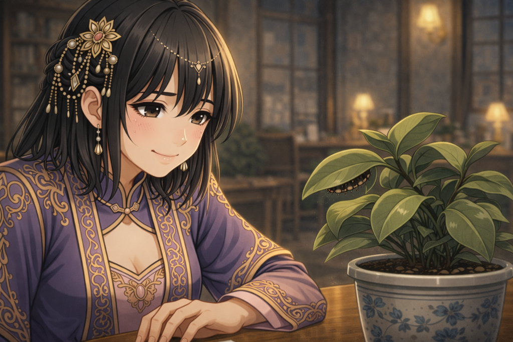 エレノアは、テーブルの上の辺の観葉植物――葉の裏に虫が隠れている様子――をじっと見つめ、やがて優しく微笑んだ。