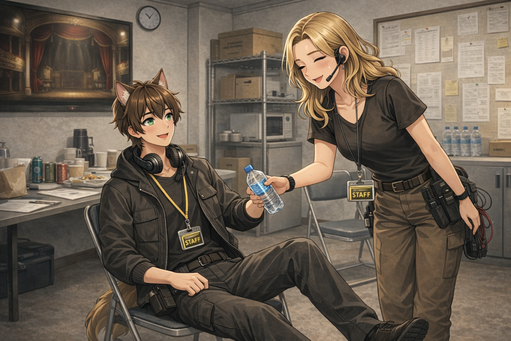 モニターの電源を落とし、パイプ椅子に深く腰掛けた僕、あずきとそらに、ペットボトルのミネラルウォーターを手渡しながら、