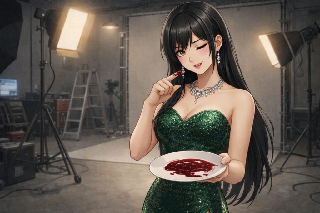撮影の小道具である「血のようなベリーソースの皿」を指先で拭い、いたずらっぽくウインクする。
