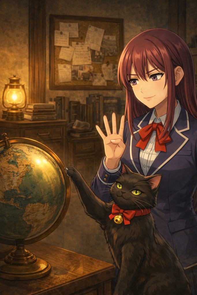 シビルは、部屋の隅にある古びた地球儀を前足で回す黒猫を見つめながら、指を4本立てた。
