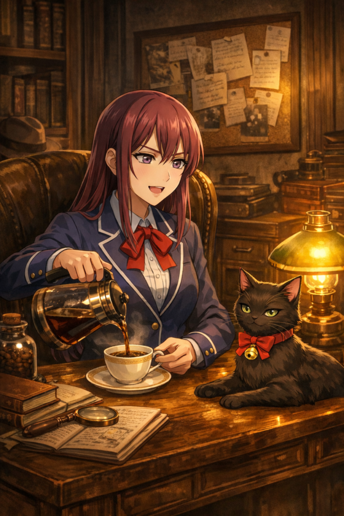 彼女の押し殺した笑い声と、同意とも取れるような彼の一鳴きが、夜の探偵事務所に長く、優しく響いていた。