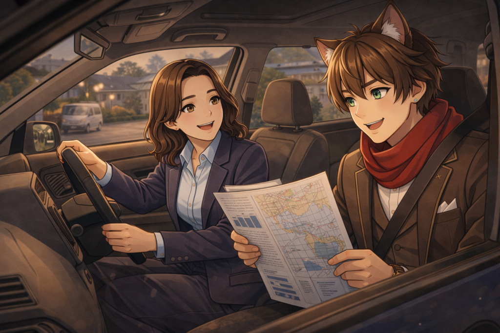 ……私の運転でよろしければ、助手席へどうぞ。