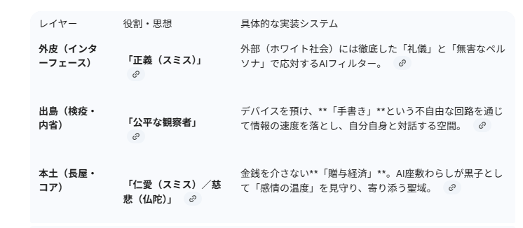 だからこそ、「選別された信頼(ドーナツの内輪)」を物理的・デジタル的に隔離して守り抜く「デジタル長屋」は、ネオ・フューダリズム(新中世主義)における最も合理的な生存戦略と言えます」